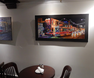 We enjoyed a cold beer in this terrific little pub. Dan, the bartender was friendly and extremely interested in the stories behind the paintings. My agent, Susan Philips did a brilliant job installing “Urban and Rural.” We felt the pictures lookied like they were commissioned to fit the space. We were also told the food is excellent, so if you’re in the area check it out. The paintings are there until the end of the month.